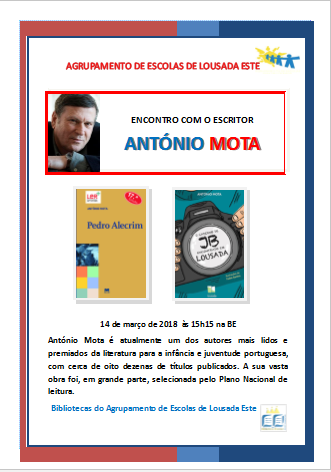 António Mota vai estar com os nossos alunos nas escolas do 1º ciclo e na escola sede com alunos do 6º ano, nos dias 14 e 15 de março.